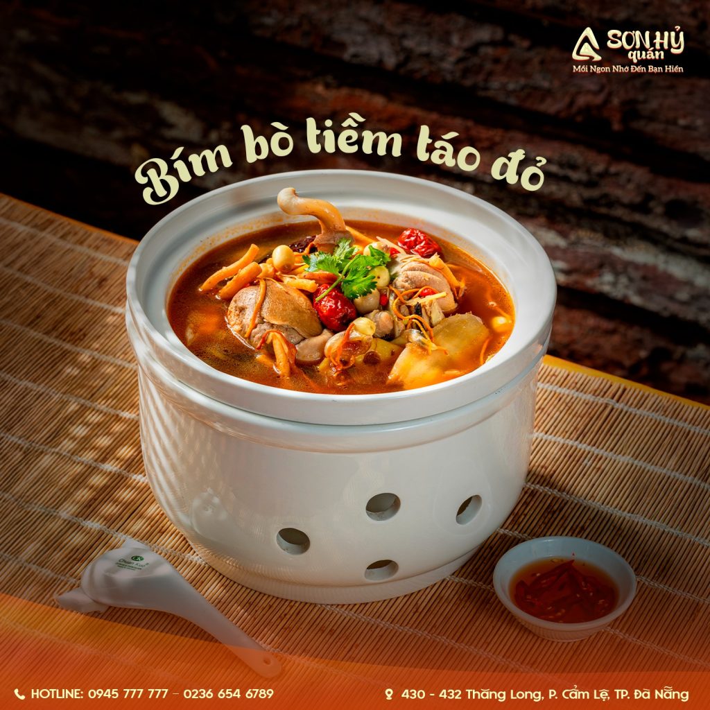 Tại Sơn Hỷ Quán – 430-432 Thăng Long, Cẩm Lệ, Đà Nẵng, hai món Bím bò tiềm táo đỏ và Chân dê tiềm hạt sen chính là lựa chọn lý tưởng để vừa thưởng thức, vừa bồi bổ cơ thể trong tiết trời se lạnh.